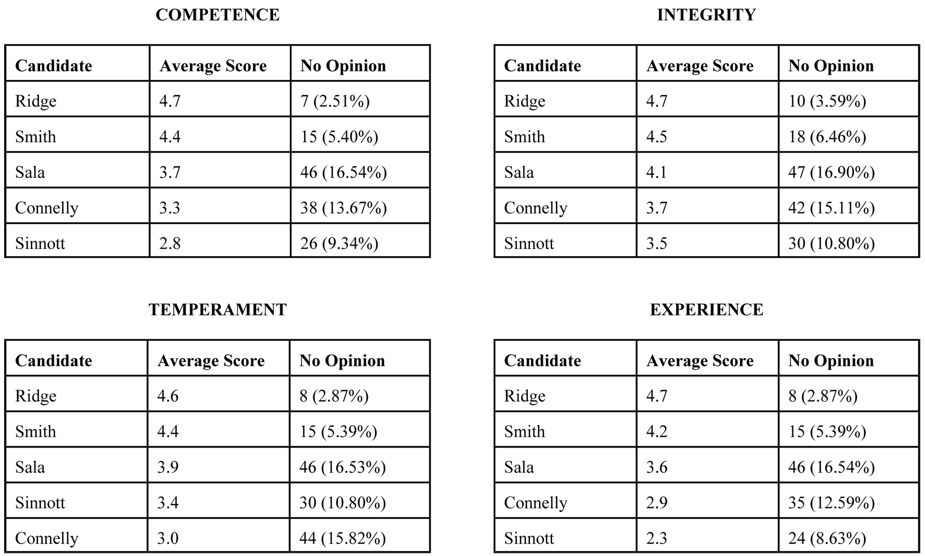 In the same poll, ECBA members were asked to evaluate on a scale of 1 to 5 (with 1 representing “strongly disagree” and 5 representing “strongly agree”) each candidate’s competence, integrity, temperament, and experience. As such, the more strongly a member agreed that the candidate possesses such a quality, the higher the score. The more strongly that a member disagreed that the candidate possesses such a quality, the lower the score. “Competence” is defined as intellectual capability, judgment, legal writing and analytical ability, industry, knowledge of the law, scholarship and academic talent, and professional contributions. “Integrity” is defined as good moral character, ethics, honesty, and trustworthiness. “Temperament” is defined as compassion, decisiveness, open-mindedness, sensitivity, courtesy, patience, freedom from bias, and commitment to justice. “Experience” is defined as years in practice, diversity of legal experience, trial experience, work with administrative agencies and arbitration boards, teaching, and public service. The results are shown below.