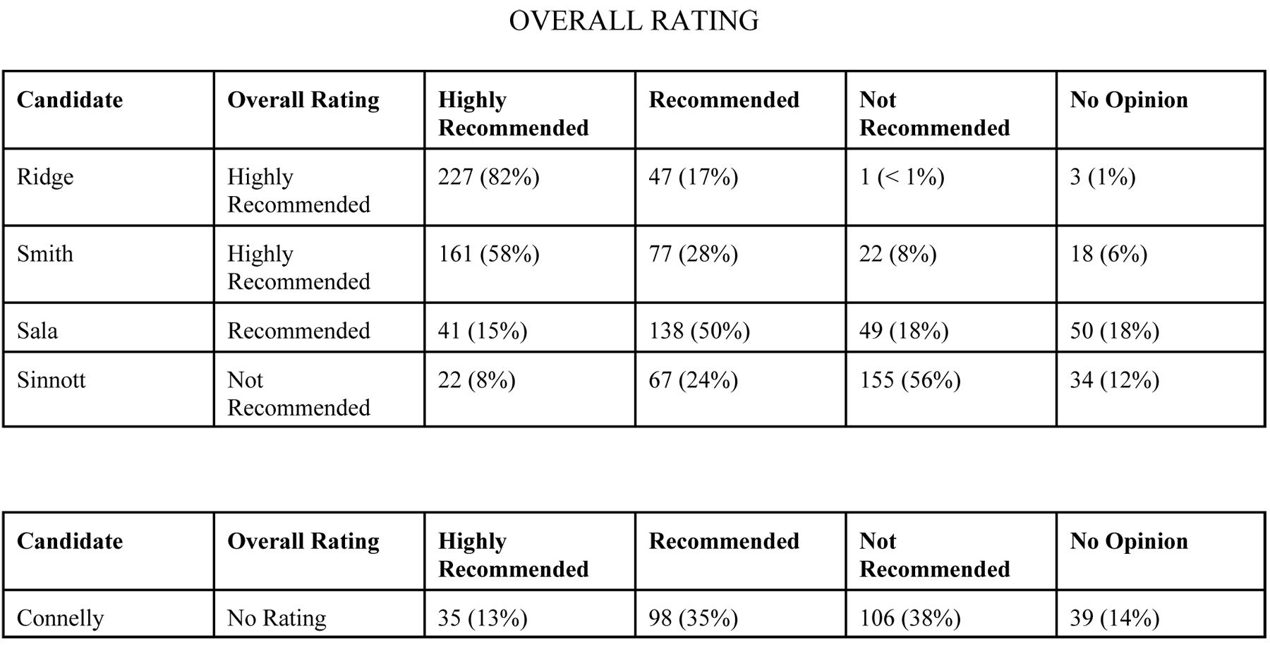 For a candidate to receive a rating of “Highly Recommended,” more than 50% of the membership returning ballots must rate a candidate as “Highly Recommended.” For a candidate to receive a rating of “Recommended,” more than 50% of the membership returning ballots must rate the candidate as “Recommended. When determining whether a candidate is “Recommended” by more than 50% of the membership returning ballots, votes received in the categories of “Highly Recommended” and “Recommended” are combined. For a candidate to receive a rating of “Not Recommended,” more than 50% of the membership returning ballots must rate the candidate as “Not Recommended.” Where more than 50% of the membership does not rate the candidate as “Highly Recommended,” “Recommended” or “Not Recommended,” the candidate received no rating. The results are shown below.