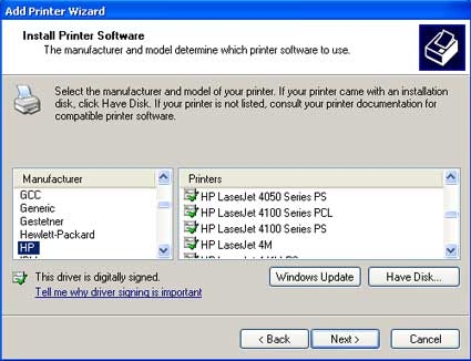 Before making a selection, a good choice is to first click on the Windows Update button at the bottom of the printer selection window. Not all printers that Windows supports are initially installed on the computer, and printer drivers are added or updated frequently. Clicking this button will cause Windows to update its printer selection list, and additional printers may be shown that weren't previously available - be patient: updating the printer list can take a few minutes.